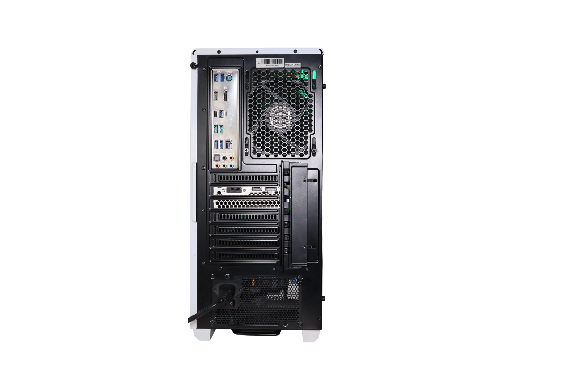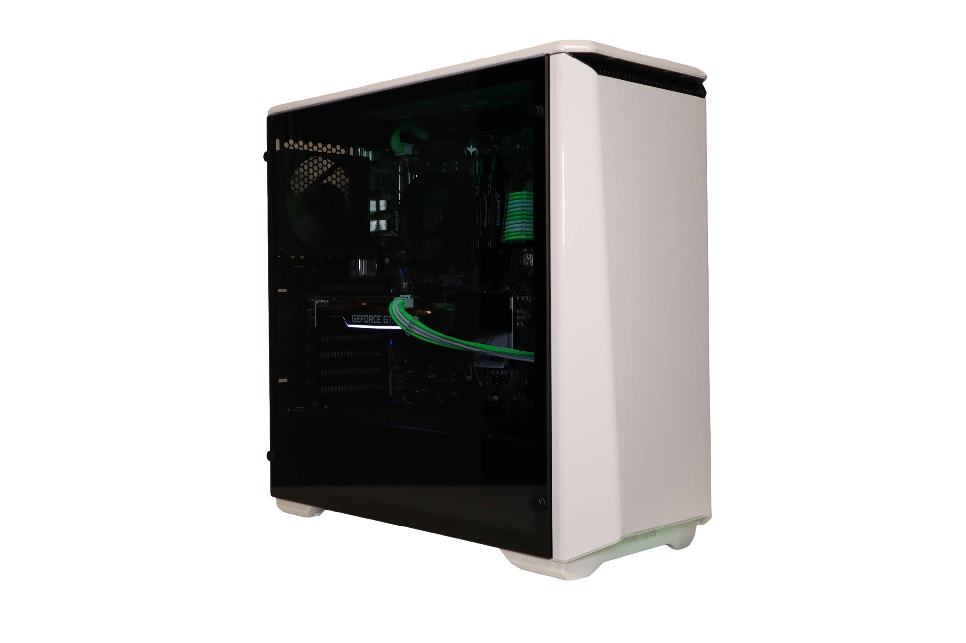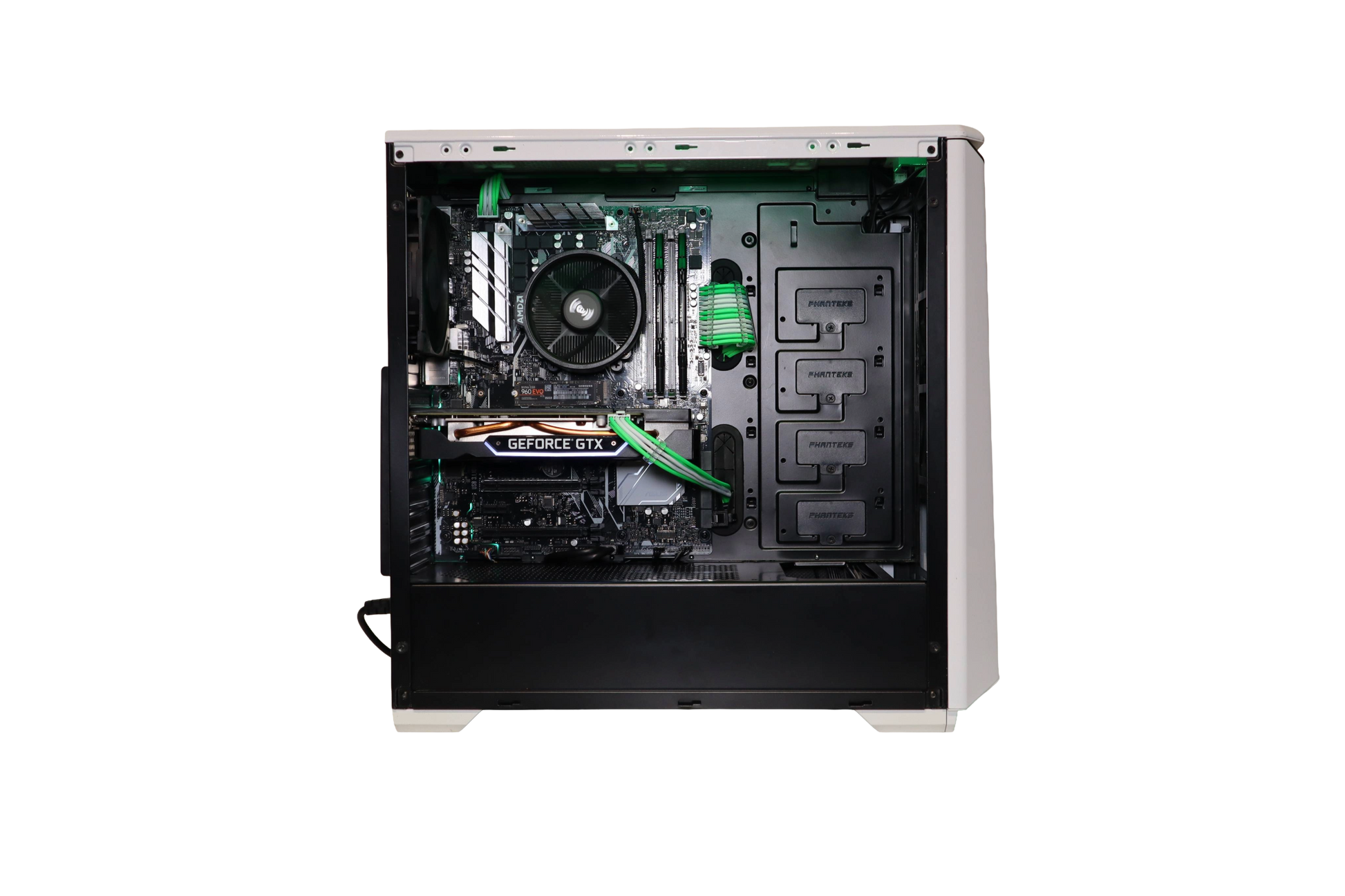 Tietokoneeseen on asennettu vihreä/valkoiset kaapelit emolevylle, prosessorille ja näytönohjaimelle.